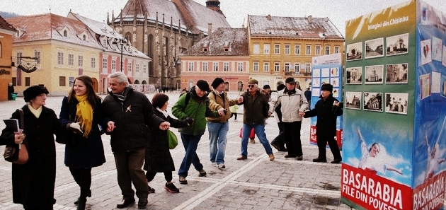 50 de persoane, braşoveni şi basarabeni, s-au prins azi în Hora Unirii în Piaţa Sfatului, în cinstea unirii Basarabiei cu România, de la 27 septembrie 1918.
