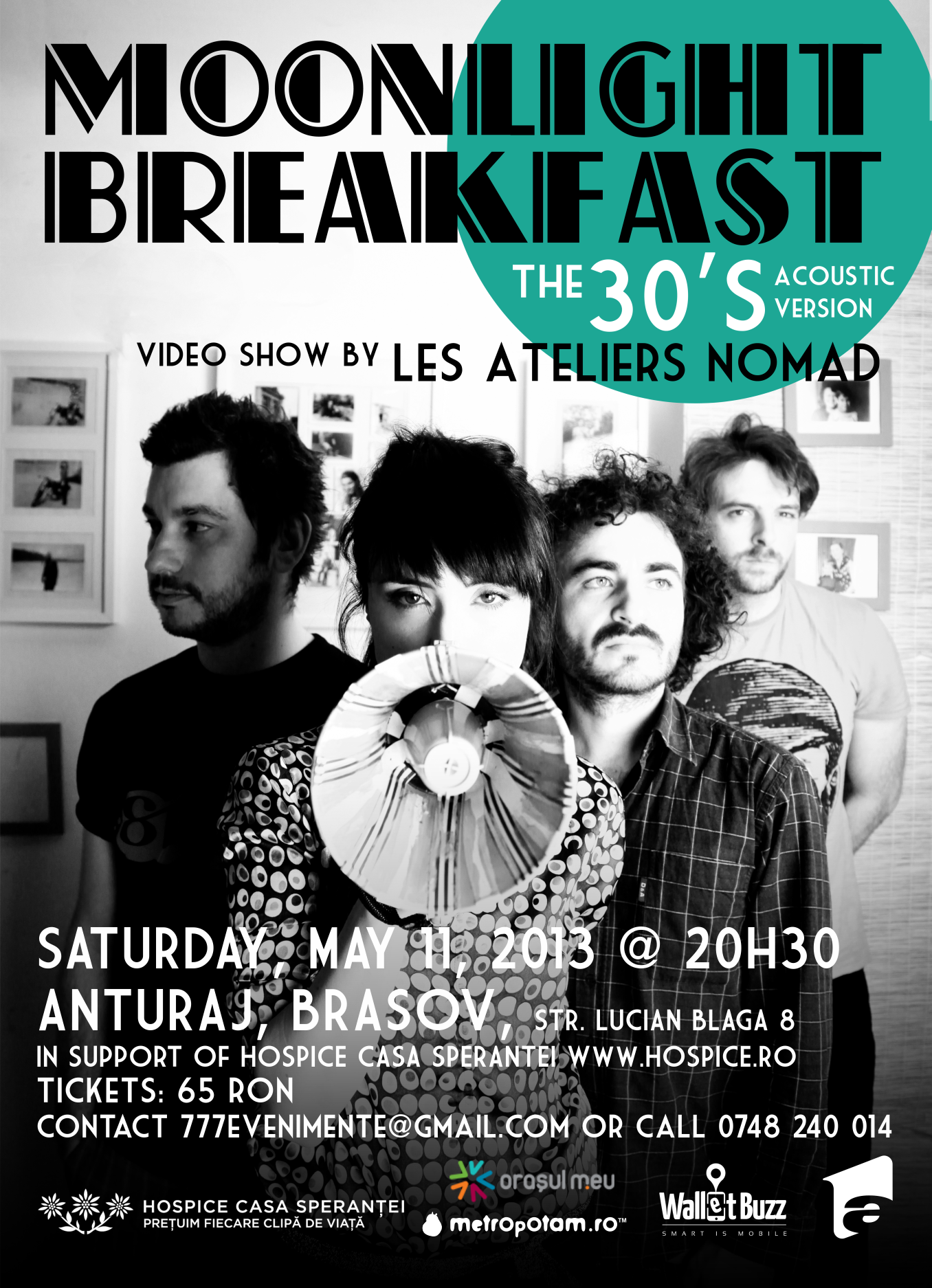 Sâmbătă, 11 mai, trupa Moonlight Breakfast susţine un concert în localul Anturaj din Braşov (str. Lucian Blaga, nr.8), începând cu ora 20.30. Membrii trupei au decis să susţină cauza HOSPICE Casa Speranţei donând fundaţiei 10% din onorariul perceput cu acest prilej şi 10% din suma încasată prin vânzarea biletelor.