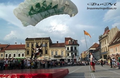 Două paraşutiste şi un parapantist au aterizat ieri în Piaţa Sfatului, chiar pe salteaua de aterizare adusă special în acest scop. A fost cel mai aşteptat moment al festivalului Fatzada. Pe lângă aterizarea paraşutiştilor, organizatorii le-au oferit braşovenilor şi posibilitatea de a asista la un scurt show aviatic, trei avioane ale Aeroclubului de la Ghimbav survolând la mică înălţime Piaţa Sfatului, apoi salutând publicul, printr-o balansare a aparatelor de zbor sau, cum spun piloţii, „au dat din aripi”.