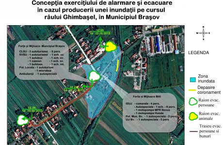 Situaţia va fi următoarea: „În dimineaţa zilei de 22 octombrie 2013, la ora 06,30, în zona Bran Moieciu au fost ploi abundente de 96 l/metru pătrat/oră, iar în zona Ghimbav -Braşov au căzut precipitaţii de 40 l/mp/h. Urmare a acestor căderi de apă pe râul Ghimbăşel s-a format o viitură având un debit de 106mc/s la staţia hidrologică Râşnov, la ora 08.00. Se estimează că viitura ajunge pe teritoriul UAT Brasov în jurul orei 10.00 avand un debit estimativ de 130mc/s, debit ce va depăşi cota de inundaţie a râului Ghimbăşel. S-a dispus închiderea stăvilarelor de pe canalele colectoare din cartierul Stupini. La ora 10.30 s-a depăşit coranamentul digului, apa inundând zonele adiacente. Urmare a debitului mare s-a inundat aproximativ 10 hectare de teren arabil, 150 de metri din strada Fagurelui şi 10 gospodării şi incinta fermei agricole, fiind necesară evacuarea a 19 persoane”.