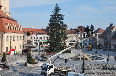 Bradul de Crăciun a fost montat marți de dimineață în Piața Sfatului de lucrătorii Regia Pădurilor Kronstadt. Pomul are o înălţime de 25 m deasupra solului (la care se adaugă trei metri în suportul amenajat sub nivelul solului), vârsta de 140 de ani şi provine din zona Timişul de Sus, de pe un teren al municipalității. Pomul a fost extras la ora 1.00 din pădure, iar în Piața Sfatului a ajuns la ora 4.00.