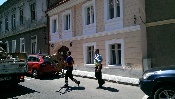 Polițiștii locali împreună cu angajați ai serviciului de salubritate strâng toate dispozitivele de blocare a locurilor de parcare și tăblițele inscripționate de brașovenii, în Centrul Vechi, cu care aceștia și-au delimitat locurile de parcare din fața porților.