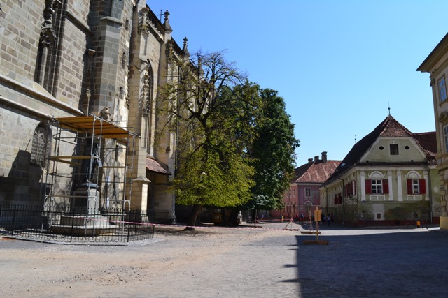 Dacă în Piața Sfatului s-a mai reparat pavajul, iar pe alte străduțe din Centrul istoric asfaltul a fost înlocuit cu piatră cubică și arterele au devenit pietonale, Curtea Bisericii Negre a rămas un loc prăfuit. Turiștii trec repede pe lângă biserică, fac una-două poze, ascultă scurtele explicații ale ghizilor, după care se refugiază în locuri mai prietenoase.