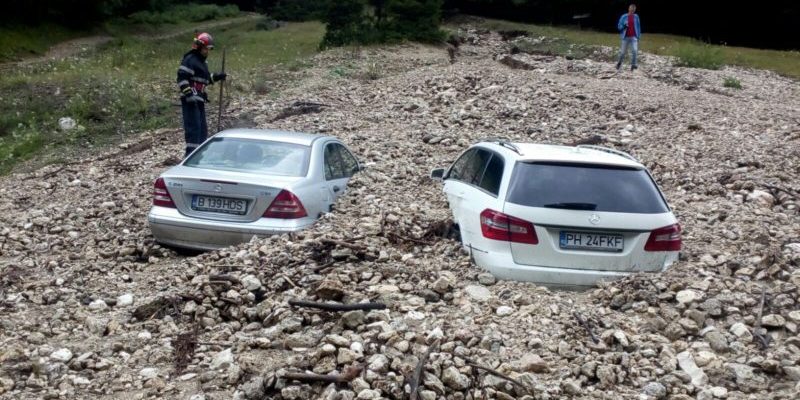 Două mașini au fost îngropate de viitură la Fântâna lui Botorog, în Zărnești