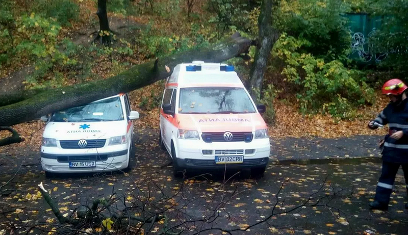 Un arbore doborît de vânt a căzut peste două ambulanțe ale Crucii Roșii. Evenimentul s-a petrecut marți dimineața în zona de După Ziduri, la sediul Crucii Roșii.