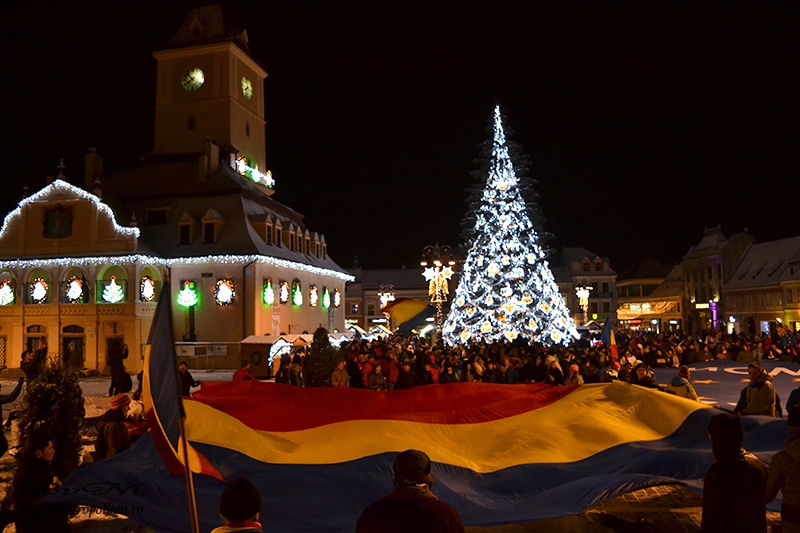 În Piața Sfatului, brașovenii au desfășurat tricolorul de mari dimensiuni, au cântat „Deșteaptă-te române”, dar au și ținut un moment de reculegere în memoria Regelui Mihai.