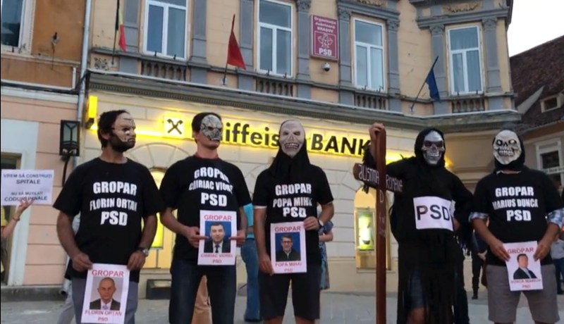 În jur de  100 de protestatari au organizat în această seară o „înmormântare“ a justiției, la care au adus inclusiv un coșciug și o cruce. Mai mulți tineri, îmbrăcați în negru, au jucat rolul “celor șapte parlamentari-gropari de la PSD” care și-au dat votul pentru modificarea codurilor penale, considerată o „mutilare a justiției“. Tinerii au purtat măști, subliniind astfel că la fel fac și politicienii care promit orice în campanie, până obțin votul electoratului. Participanții la “slujbă”  au purtat tricouri inscripționate cu numele și partidul fiecăruia dintre parlamentarii brașoveni care au votat pentru mondificarea codurilor.