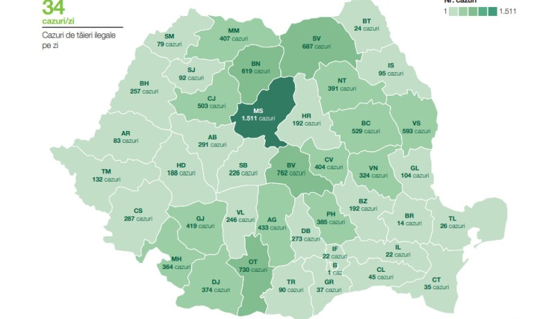 12.487 de cazuri de tăieri ilegale la nivel național, cu 32% față de anul 2016, este bilanțul prezentat recent de Greenpeace România. Practic, în medie, anul trecut au fost câte 34 de cazuri pe zi. În acest top, Brașovul ocupă locul al doilea, cu 762 de cazuri, la mare distanță de primul loc, ocupat de județul Mureș, cu 1.511 de cazuri.