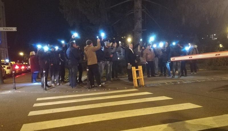 Protestul din fața Prefecturii a fost unul tăcut, în care oamenii nu au scandat. Singura manifestare a celor care au venit în fața clădirii unde își are biroul reprezentantul Guvernului în județ a fost aceea de a aprinde luminine telefoanelor, mai ales că la Prefectură nu era niciun bec aprins pe latura unde s-a ținut protestul.