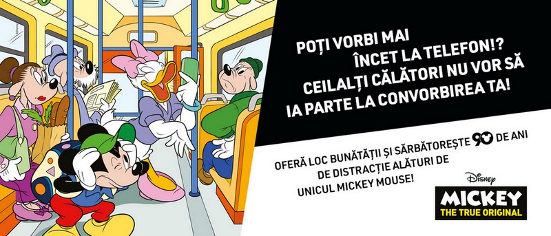 Afișele, realizate cu ocazia împlinirii a 90 de ani de „nașterea” celebrului Mickey Mouse, vor fi plasate în autobuze, troleibuze și în terminalele RATBV SA și reprezintă rezultatul colaborării operatorului local de transport în comun și a Asociației Metropolitane pentru Dezvoltare Durabilă a Transportului Public Brașov cu reprezentanții studiourilor „Disney”.