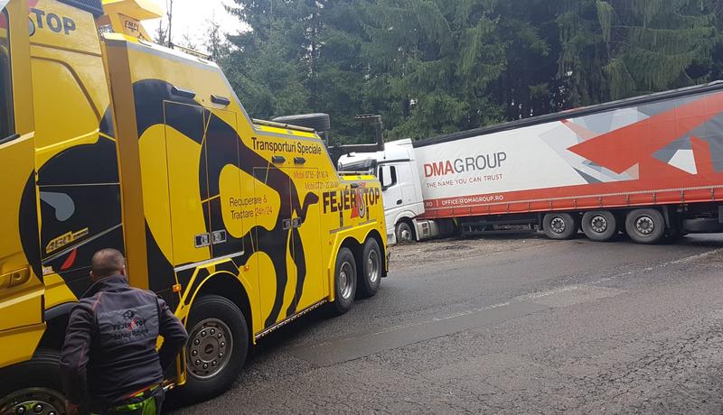 Drumarii au avut nevoie de mai bine de o oră de lucru și de un utilaj special, pentru a repune întregul autotren pe carosabil.