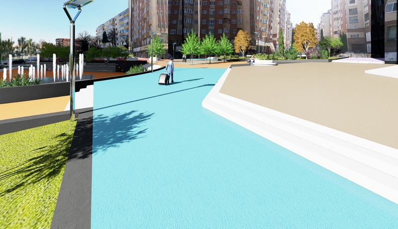 Pentru creşterea vizibilităţii zonei pietonale, dar şi pentur a crea o identitate vizuală ușor de observat de pe înălțimile din jur (Tâmpa și Dealul Melcilor) pardoseala va fi colorată și va avea anumite desene, iar pavajul va fi realizat din asfalt acoperit cu material termoplastic, care va asigura nu numai impermeabilitate și ușurință în drenarea apelor pluviale, ci va fi și un material potrivit pentru rotile, va amortiza șocurile și va reduce zgomotul.