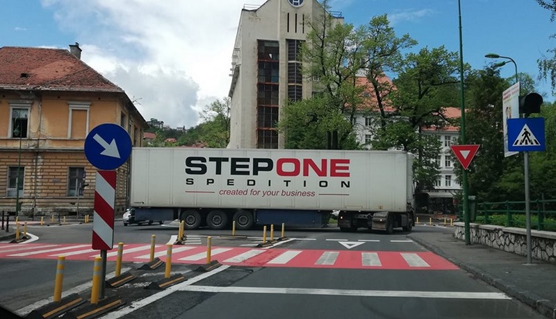 TIR rătăcit de GPS în Centrul Istoric al Brașovului. A rămas blocat în sensul giratoriu de la Maternitate