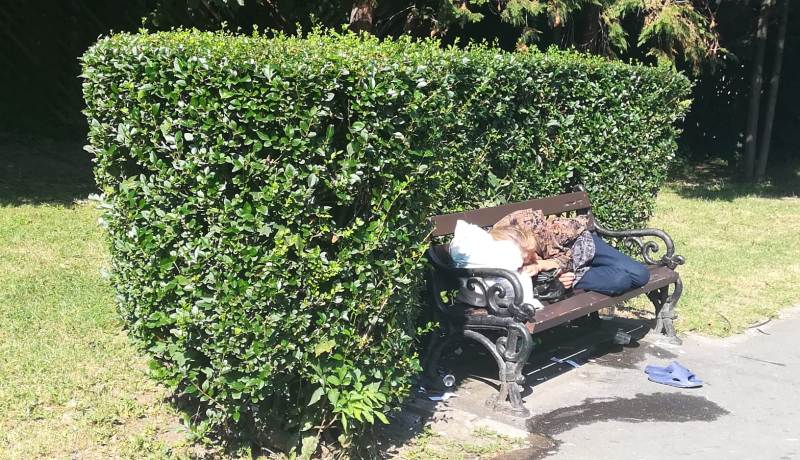 De exemplu, vineri, în jurul orei 10.30, pe două bănci dormeau nestingheriți oameni ai străzii.