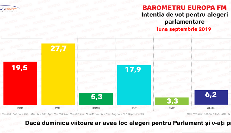 Dacă alegerile parlamentare ar avea loc acum, în loc de anul viitor, 27,7 dintre cei care spun că ar merge sigur la vot ar opta pentru PNL, arată Barometrul EFM, realizat de IMAS în luna septembrie, în scădere cu aproape un procent și jumătate față de luna august. PSD trece pe locul doi cu 19,5%, în creștere cu aproape două procente față de luna august. USR pierde aproape două procente și că cade pe locul trei – cu 17,9%.