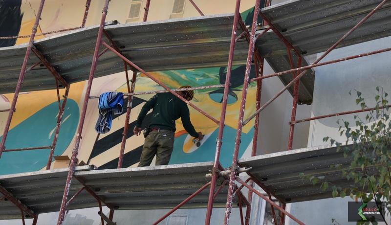 În primă fază a fost realizată o pictură de 160 de metri pătraţi din zid, până la înălțimea de 3,5 m. În această toamnă a fost retencuită și restul de fațadă, iar vineri, pe schele a apărut deja un pictor.