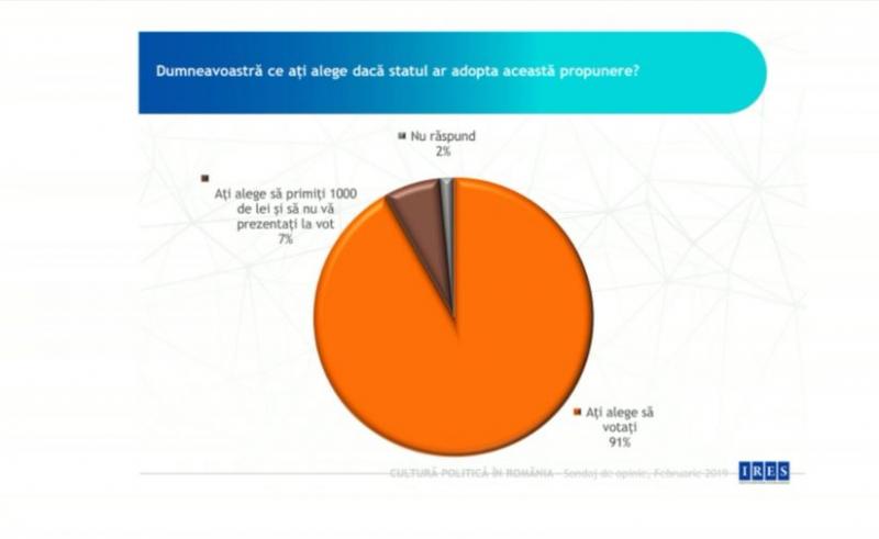 Procentele se schimbă atunci când oamenii au fost întrebați ce ar alege dacă statul ar adopta o astfel de măsură: 91% au spus că ar alege să voteze, iar 7% au spus că ar alege suma de 1.000 de lei ca să nu meargă la vot. 2% nu au răspuns.