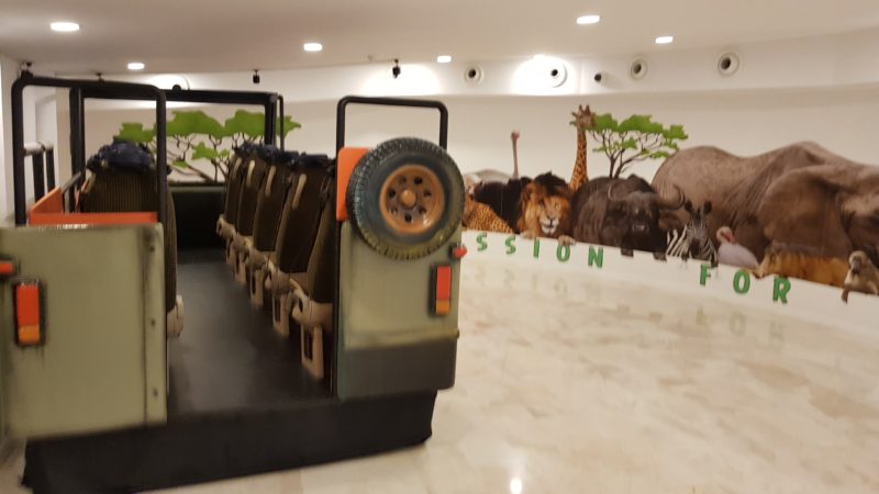 Experienţa este completată de senzaţii fizice care imită traseul autovehiculului pe un teren accidentat (denivelări, podeţ de lemn), precum şi de momente inedite care previn monotonia unei simple plimbări (un elefant aruncă apă cu trompa în direcţia privitorului, un rinocer urmăreşte maşina şi se izbeşte de aceasta).