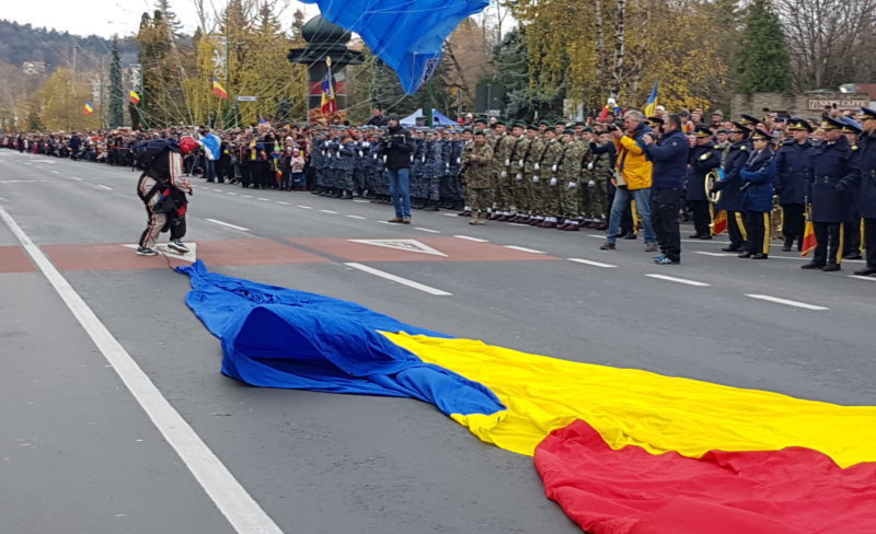 Parașutistul a adus la sol un drapel de mari dimensiuni, în aplauzele celor prezenți, pe care l-a predat autorităților, și a dat astfel startul paradei militare de Ziua Națională a României.