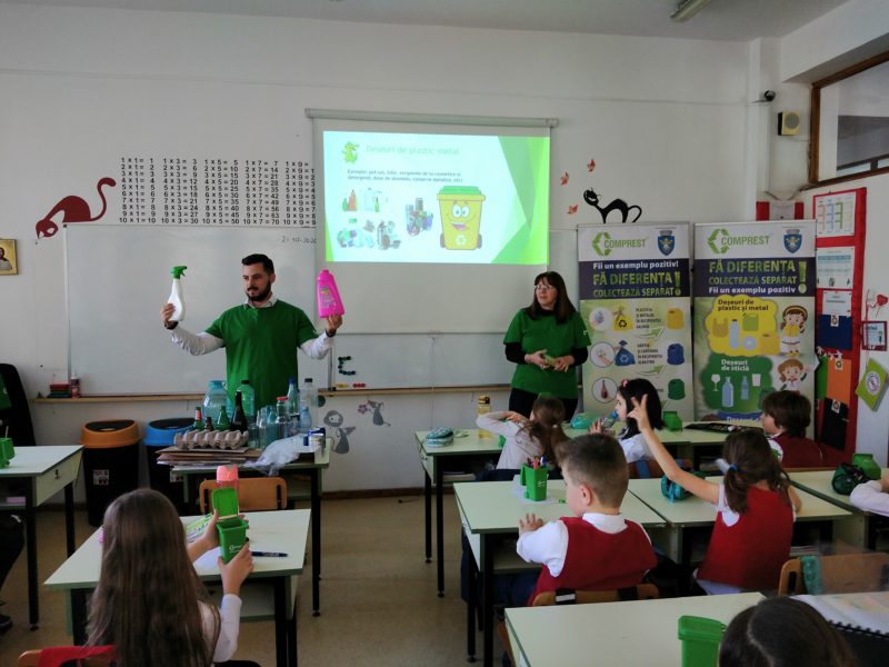 După lectură, împreună cu reprezentanții Comprest, micuții au aflat în mod practic cum ar trebui să recicleze deșeurile și au primit din partea operatorului de salubrizare și un cadou, o pubelă în miniatură din material reciclat. De altfel, elevii au mai aflat că din deșeurile de plastic pe care le vor recila se vor face fibre ce vor fi folosite apoi la fabricarea unor produse textile, dar și că dacă vor pune în pubelele albastre destinate reciclării hârtiei vechile caiete, acestea se vor transforma apoi în caiete de noi sau coli pe care le vor putea utiliza la școală. În plus, elevii au mai aflat și ce înseamnă simboluri de pe ambalajele reciclabile și au vizionat și câteva filme despre sortarea deșeurilor reciclabile la depozitul ecologic, dar și care este de fapt drumul deșeurilor pe care ei le aruncă și cum ajung cele reciclabile să fie refolosite sub forma unor produse.