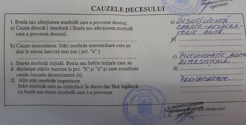 Astfel, potrivit certificatelor de medicale prin care s-au constatat cauzele decesului, bebelușii, născuți prematur, au murit în urma insuficienței cardio-respiratorii acute, ei având însă un diagnostic de pneumopatie acută interstițială. Adică diagnosticul cu care fuseseră internați cu câteva zile înainte la Spitalul de copii.