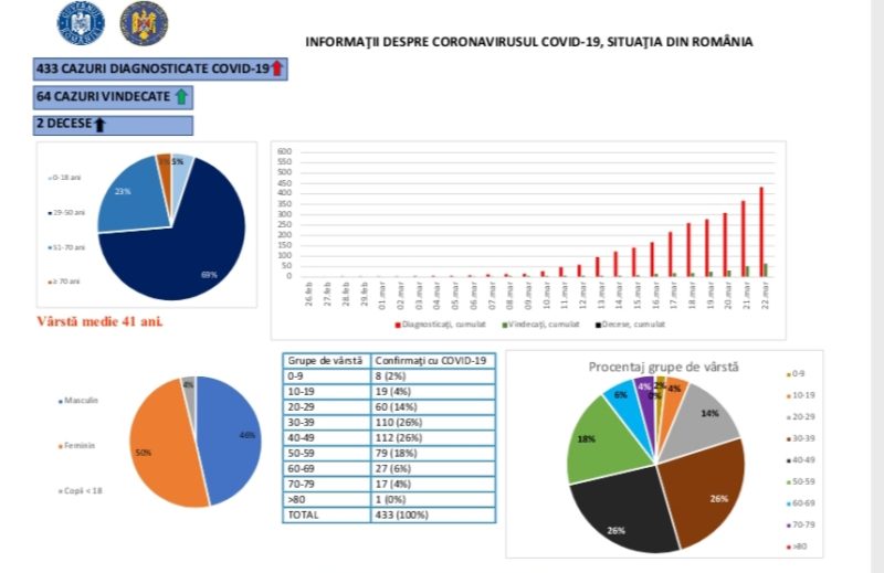 Până în acest moment, pe teritoriul României, au fost confirmate 433 de cazuri de persoane infectate cu virusul COVID – 19 (coronavirus). Dintre cele 433 de persoane confirmate pozitiv, 64 au fost declarate vindecate și externați. Cei vindecați sunt de la Timișoara – 43, de la București -3 , Craiova – 3, Constanța – 2 și la Iași -1.