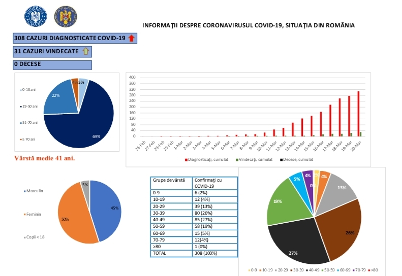Conform raportului de la ora 13.00 transmis vineri de Grupul de Comunicarea Strategică, 31 de persoane au fost confirmate cu infecție cu COvid-19, în ultimele 24 de ore, iar alte 31 au fost declarate vindecate. Astfel, până acum, în România au fost confirmate 308 cazuri, 11 dintre pacienți fiind internați la ATI, în stare gravă.