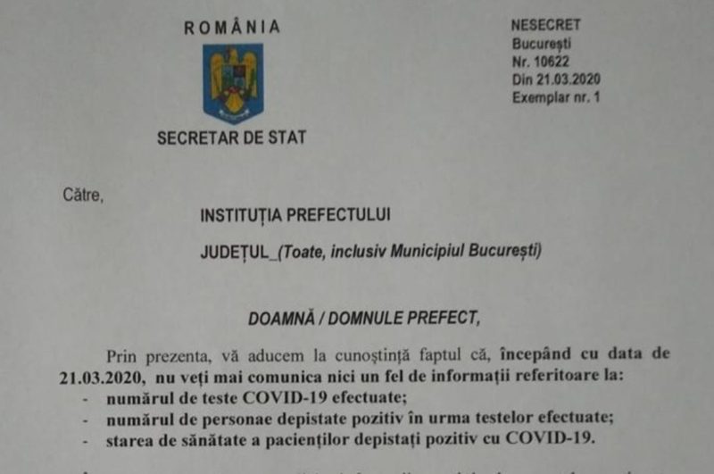Guvernul interzice prefecților să dea nformații presei sau publicului, legate de COVID-19 și modul în care se extinde situația. Conform documentului semnat de secretarul de stat din Ministerul Afacerilor Interne, Gheorghe Sorescu, prefecții nu vor mai putea oferi publicului date despre numărul de teste de COVID-19 efectuate, numărul de rezultate pozitive sau starea pacienţilor testaţi pozitiv.