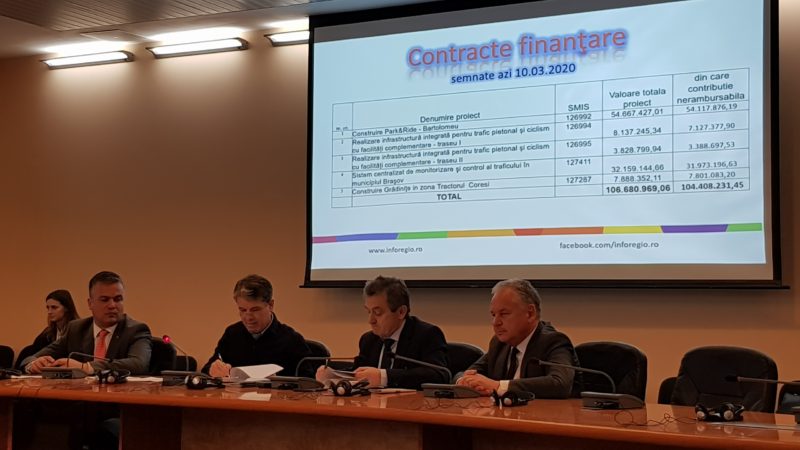 Primăria municipiului Brașov a semnat azi cinci contracte de finanțare din fonduri europene, în valoare de 104,408 milioane lei, pentrubpatru proiecte se mobilitate urbană și pentru construirea unei grădiniței noi.