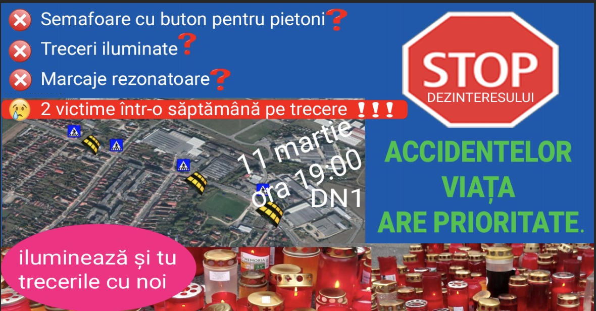 După ce în perioada 25 februarie – 10 martie, adică într-operioadă de două săptămăni, pe trecerile de pietoni din Ghimbav s-au produs trei accidente grave, dintre care două mortale, fără ca autoritățile să dea vreun semn că vor să ia măsuri pentru protejarea participanților la trafic, ghimbășenii vor ieși în stradă.