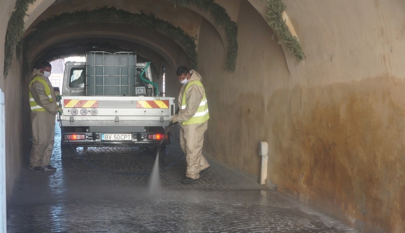 Azi se lucreză la spălarea şi dezinfectarea zoneor pietonale din Centrul Istoric, după cum au precizat reprezentanţii operatorului de salubritate Comprest.
