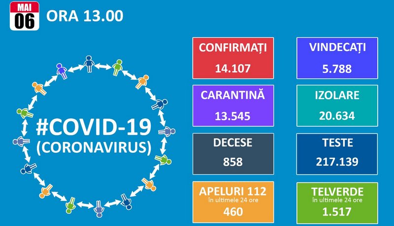 Până astăzi, 6 mai, pe teritoriul României, au fost confirmate 14.107 de cazuri de persoane infectate cu virusul COVID – 19 (coronavirus). De la ultima informare transmisă de Grupul de Comunicare Strategică, au fost înregistrate alte 270 de noi cazuri de îmbolnăvire.