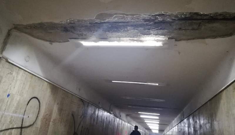 Nu este nimic grav, am văzut că s-a și remediat. Era doar un strat subțire de tencuială la rostul între tronsoanele pasajului subteran. Nu pune în pericol stabilitatea și rezistența construcției.