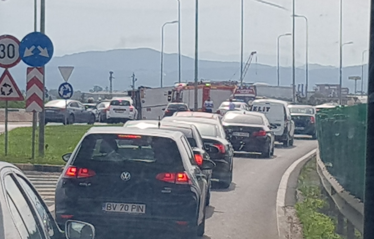Un TIR s-a răsturnat în sensul giratoriu de pe DN 1, dintre localitățile Brașov și Ghimbav, în zona Ocolitoarei. La față locului intervin un echipaj ISU și un echipaj SMRD.
