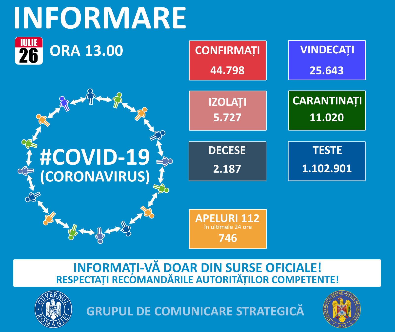 Până la această dată, la nivel național, au fost prelucrate 1.102.901 de teste. Dintre acestea 15.098 au fost efectuate în ultimele 24 de ore, 8.679 în baza definiției de caz și a protocolului medical, iar 6.419 la cerere. De asemenea, de la ultima informare făcută de GCS, au fost raportate și rezultatele a 20 de teste prelucrate anterior ultimelor 24 de ore și transmise până la data de 26 iulie.