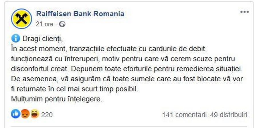 În urmă cu două zile, pe pagina de Facebook a băncii, instituția financiară își anunța clienții că, într-adevăr, există unele probleme cu tranzacțiile cu cardul.