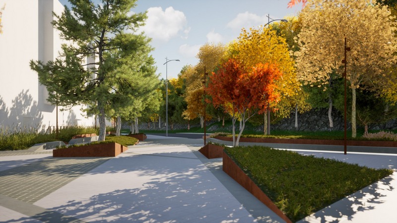 Spațiul va fi dotat cu mobilier urban, zone generoase pe care pietonii se pot așeza realizate din beton, prefabricate decorative sau piatră. Vor fi amenajate  spații verzi și terasamente și taluzuri create cu ajutorul unor pereți de sprijin cu înălțime variabilă (max. 80cm) realizați din tablă metalică tip Corten, piatră/beton, prefabricate decorative etc