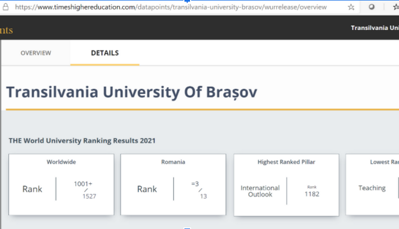 Universitatea Transilvania din Brașov a fost inclusă pentru prima dată în prestigiosul clasament internațional Times Higher Education – World University Rankings 2021, publicat astăzi. Intrată în clasament pe poziția 1001+, universitatea braşoveană ocupă locul al treilea, alături de alte 10 universități româneşti, din cele 13 universități din țara noastră care au fost incluse în acest clasament internațional.