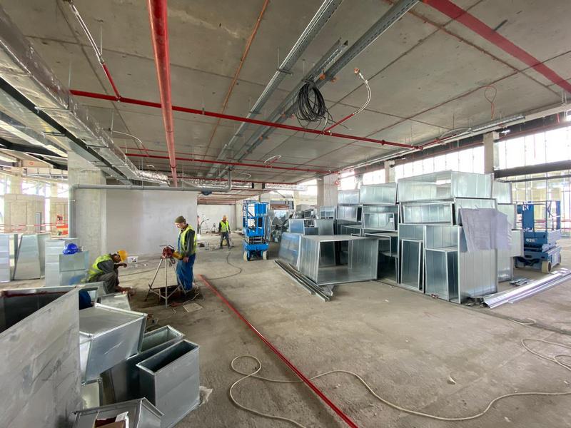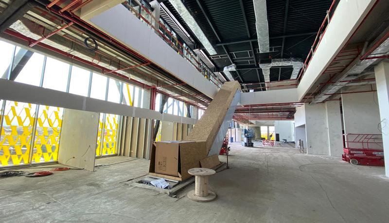 La etajul întâi, unde vor exista trei porţi de îmbarcare pentru zborurile internaţionale, pereţii au fost în mare parte acoperiţi cu sticlă, iar spaţiul destinat viitorului restaurant a fost delimitat.