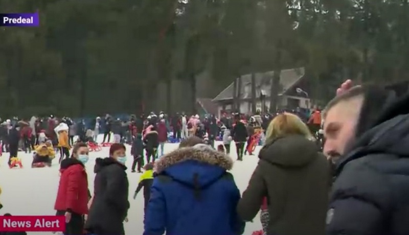 În ciuda vremii potrivnice, mulți turiști nu se lasă duși din stațiunile de la munte. Deși pârtiile din Sinaia s-au înschis azi, amatorii de schi și săniuș s-au mutat la Predeal și au umplut pârtia Clăbucet, mulți dintre ei fără a respecta nicio regulă de distanțare sau de protecție împotriva SARS-CoV-2.