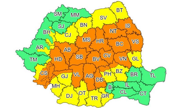Judeţele marcate integral cu Cod portocaliu sunt Iaşi, Vaslui, Vrancea, Bacău, Neamţ, Covasna, Hunedoara, Mureş, Braşov, Dâmboviţa, Argeş, Vâlcea, Sibiu, Alba şi Hunedoara şi parţial Mehedinţi, Gorj, Prahova şi Buzău.