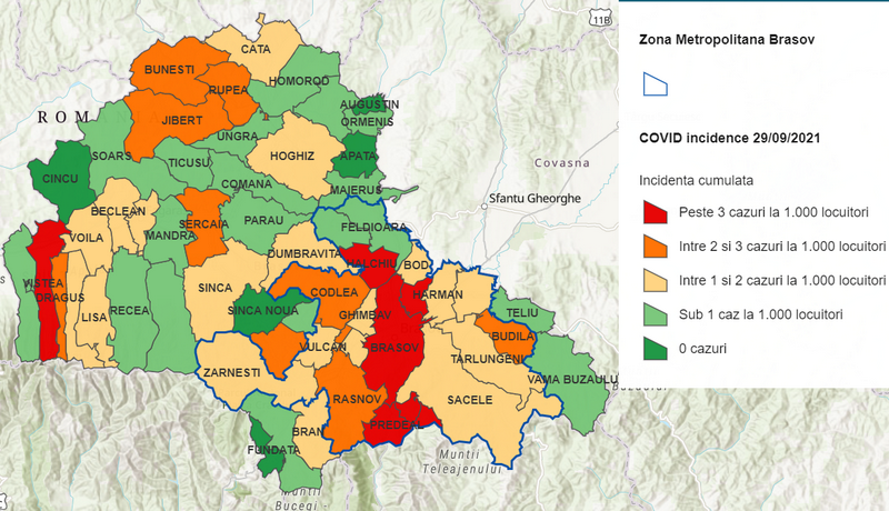 INCIDENŢA COVID – 29.09.2021. Cinci localităţi din Braşov sunt în Scenariul Roşu. Municipiul Braşov contină să înregistreze o cele mai multe cazuri active