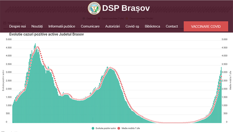 În județul Brașov, incidența a ajuns la 5,22/1.000 (3.390 cazuri active). Conform datelor disponibile pe site-ul Direcției de Sănătate Publică, valul epidemiologic din județul Brașov se apropie de cel din perioada martie aprilie (care a atins maximul la 3.412 cazuri active, în 28 martie 2021). De altfel, în 28 martie, a fost înregistrat cel mai mare număr de cazuri active din anul 2021.