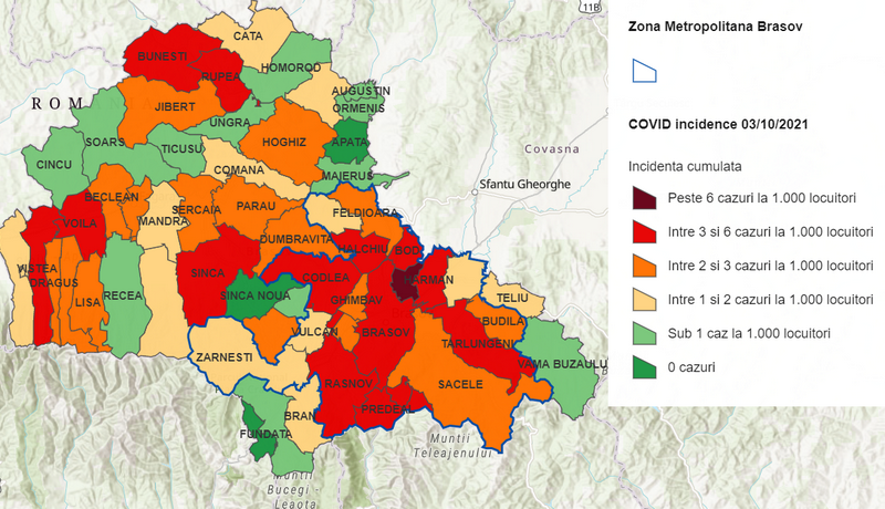 Rata de infectare în județul Brașov continuă să crească, incidența la nivelul județului Brașov ajungând la în 13 octombrie la 6,6 cazuri la mia de locuitori (4292 de cazuri active), după ce în 12 octombrie a fost de 6,4 cazuri la mie (4.163 cazuri active).