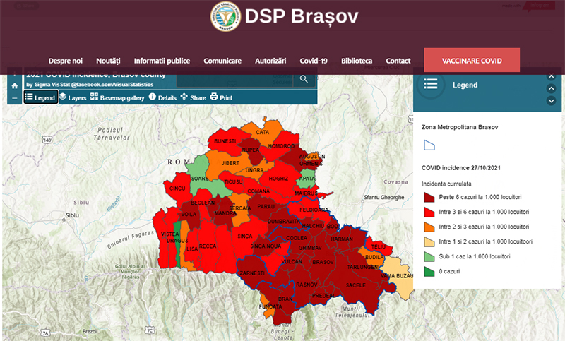 În județul Brașov, incidența era în 27 octombrie de 9,99 cazuri la mei (6.493 cazuri active), mai mare decât în data de 26 octombrie – 9,76 la mie (6.343 cazuri active).