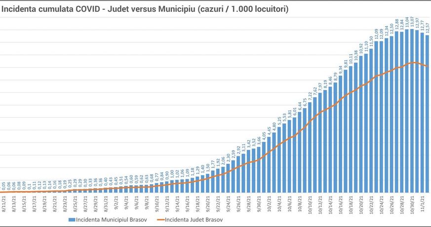 La nivelul județului Brașov incidenta a scăzut de la 10,23 cazuri la mie în 3 noiembrie, la 9,93 la mie în 3 noiembrie.
