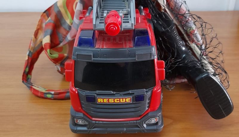 - sacoșă de culoare roșie, ce conține jucării din plastic;