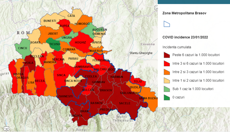 Valul 5 al pandemiei se observă și azi în cifrele comunicate de Direcția de Sănătate Publică, conform cărora, în județul Brașov inciența este azi de 9,24 de cazuri la mia de locuitori. În municipiul Brașov, numărul cazurilor active comunicate de DSP duminică, 23 ianuarie 2022, este de 3546, ceea ce reprezintă o incidență de 12,12 la mie.