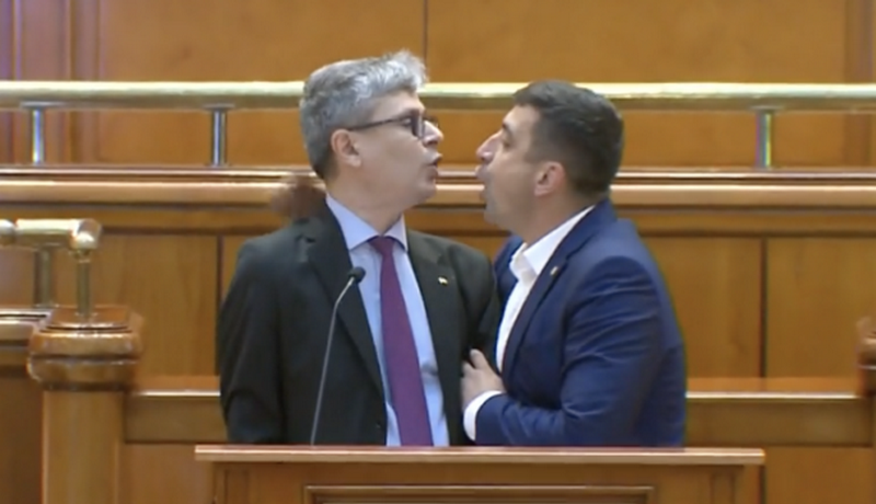 Iritat și de această afirmație, Simion s-a întors la tribună, l-a prins de mână pe ministru și a continuat să strige: „Ești un hoț”.