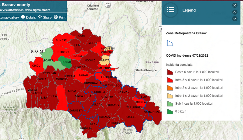 Per total, rata de infectare pe fiecare localitate în parte, comunicată de DSP Brașov la data de 07.02.2022 se prezintă astfel: